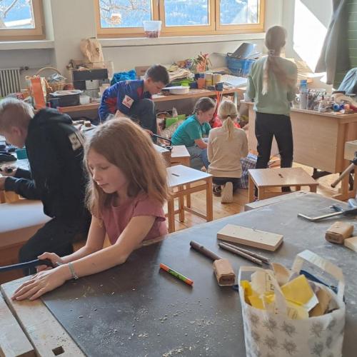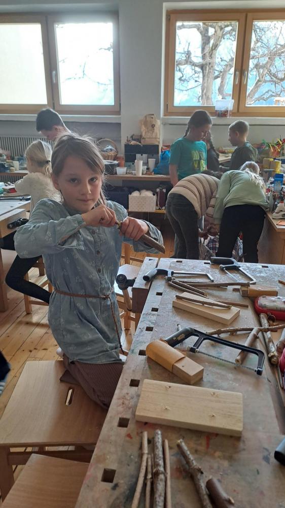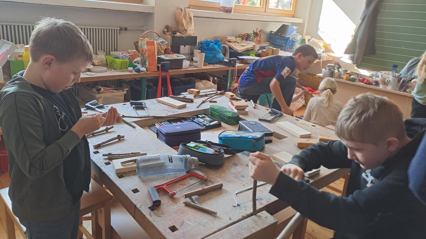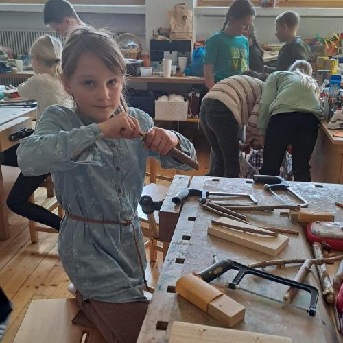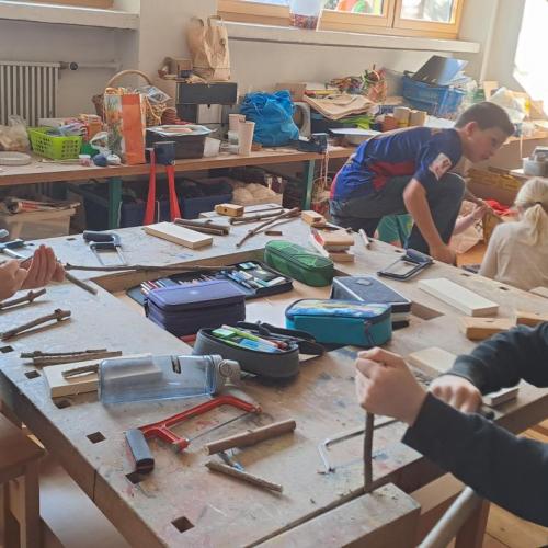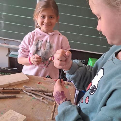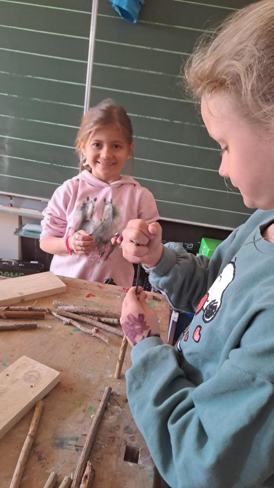 Im Rahmen eines dreistündigen Workshops bekamen die Kinder zuerst interessante Infos über Wildbienen, nach der Pause wurde im Werkraum geschliffen, gesägt und gebohrt. Jedes Kind konnte aus Holunderstöcken und Holz sein eigenes Wildbienenhotel bauen.