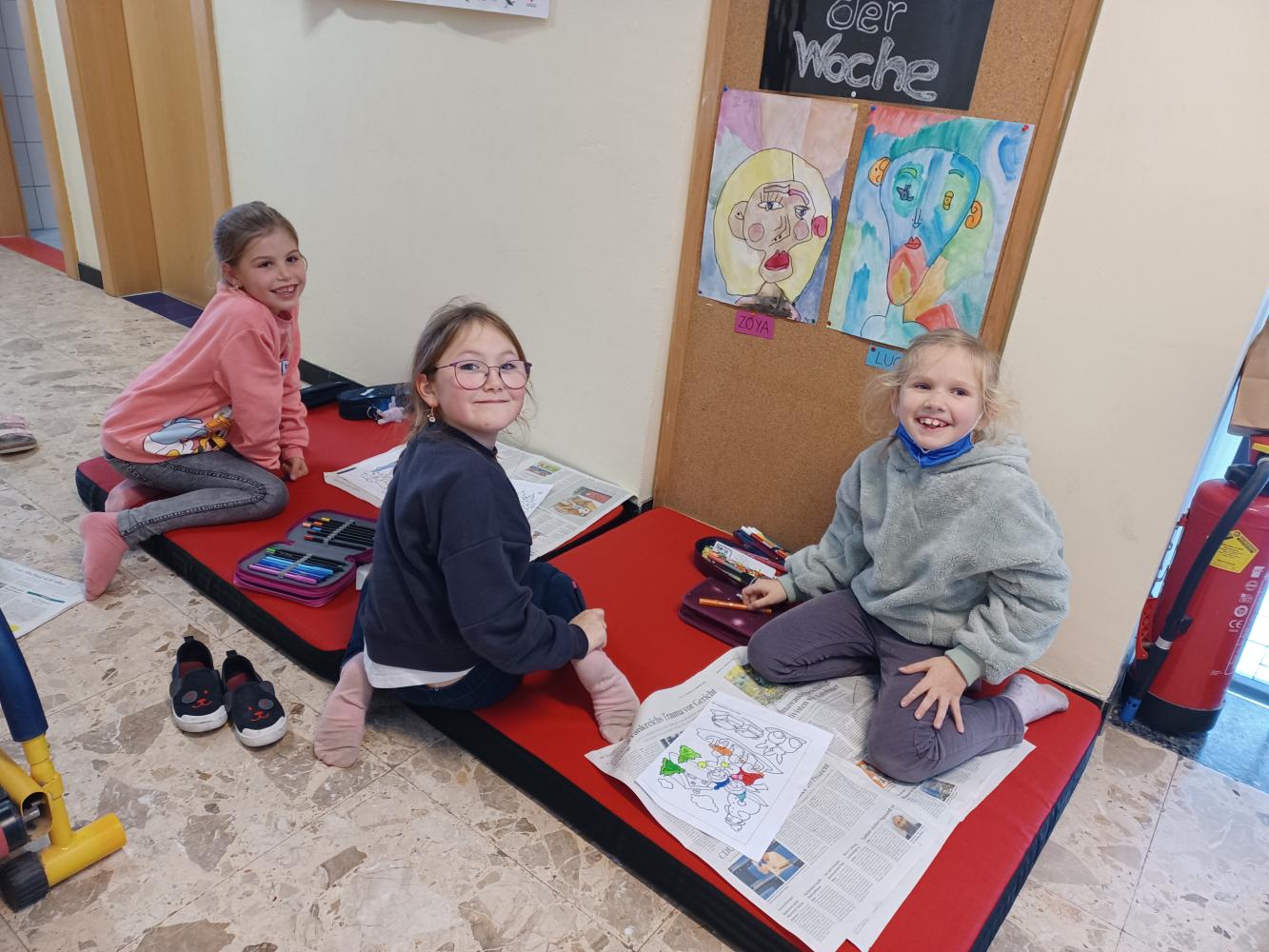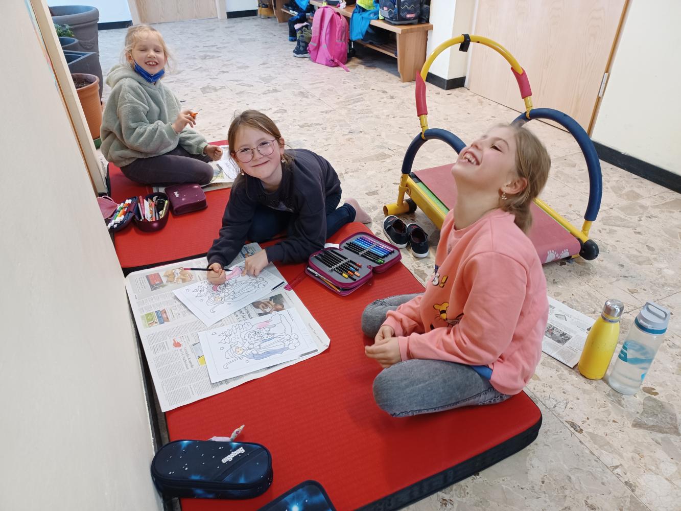 Auch Matten werden im Laufe des Herbst noch dazukommen und unsere Sitzkissen aus den Klassen können wir bei so herrlichem Herbstwetter ebenso mit nach unten nehmen.